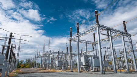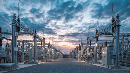 Captivating image of a modern industrial power station showcasing high voltage equipment under a cloudy sky, emphasizing energy infrastructure and urban technology.
