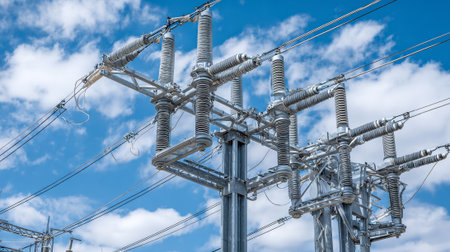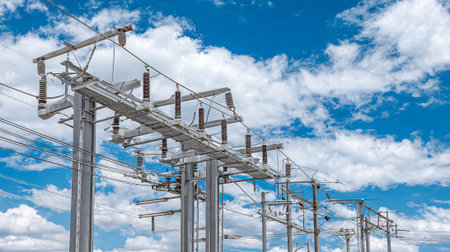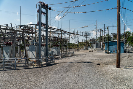 A striking view of an industrial power station landscape showcasing high voltage equipment under a bright blue sky, illustrating the energy infrastructure.