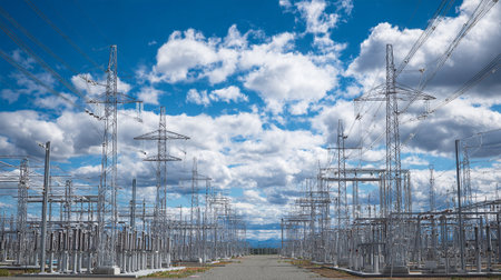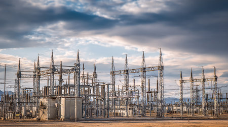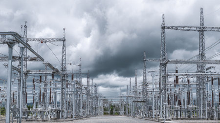 A striking view of an industrial electric power station set against a stormy sky with clouds, featuring towering utility poles and energy infrastructure.