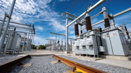 This image showcases a power substation featuring high voltage equipment under a clear blue sky. The industrial setup highlights the essential infrastructure for electricity distribution.