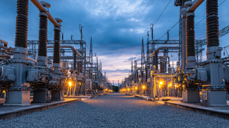 An image showcases a power plant featuring tall metal structures and overhead wires against a cloudy evening sky. The composition emphasizes the industrial nature, with dark hues, creating a sense of scale and providing a visual of energy. Suitable for various uses within the energy and infrastructure sectors.
