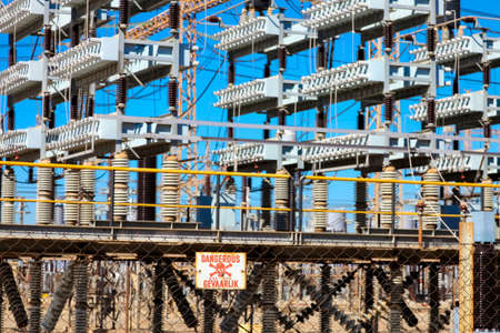 high-voltage transformer of high electrical power at a substance against the blue sky.