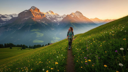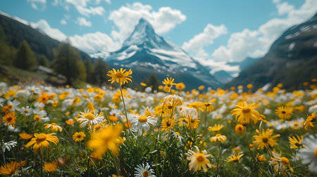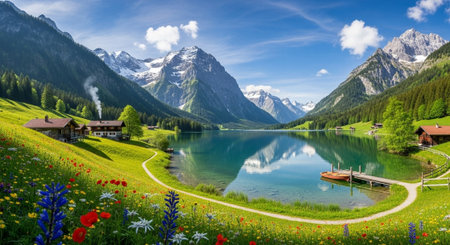 Scenic Alpine view with blooming meadows and snow-capped peaks. Copy space available for branding