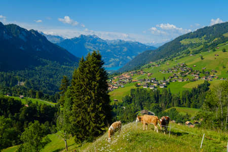 Panoramic view of the Swiss Alps and meadows. Switzerland