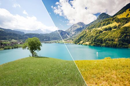 Great panorama of the town Lungern. Beautiful nature landscape. Location place Swiss Alps, Europe. Beauty of earth. Images before and after. Original or retouch, example of photo editing process.