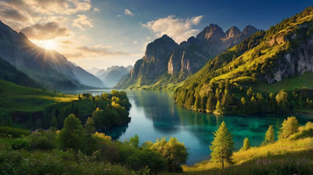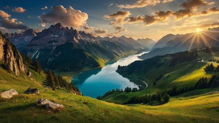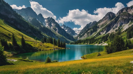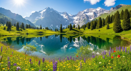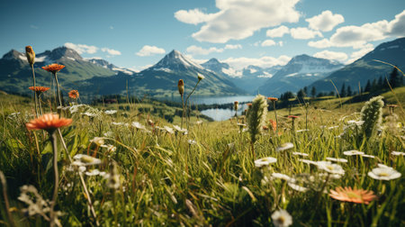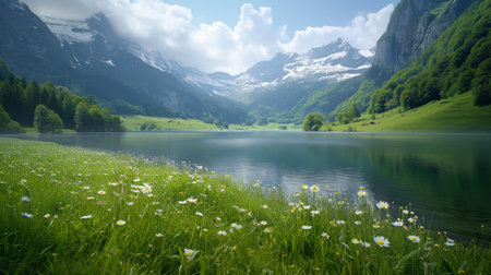 A picturesque landscape featuring a lush green meadow with wildflowers, a tranquil lake, and majestic mountains under a blue sky.