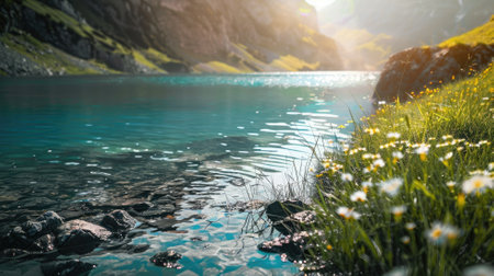 Clear mountain lake with rocky shore and wildflowers at sunrise