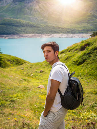 Traveler with backpack sitting on the meadow with yellow flowers and mountains in background