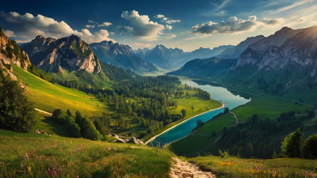 The serene landscape of the Swiss Alps, with green valleys and open space for copy