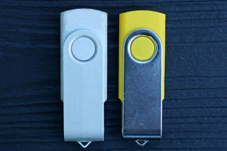 two small gray yellow closed mobile flash drive lie on a black wooden table