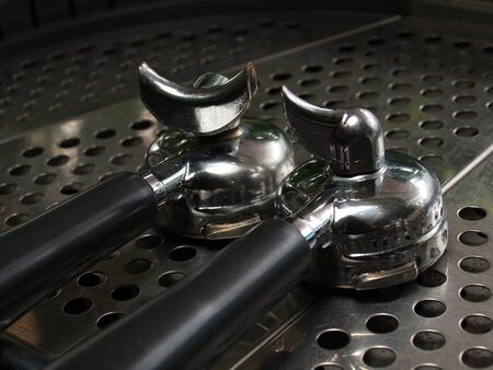 close up view of portafilters handles in a row of professional coffee machine on kitchen. buttons, sunny day, vintage color tones