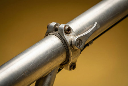 Close-up of a vintage metal bicycle frame clamp showing rusted screws and a silver quick release lever against a solid yellow background, highlighting mechanical details and texture.