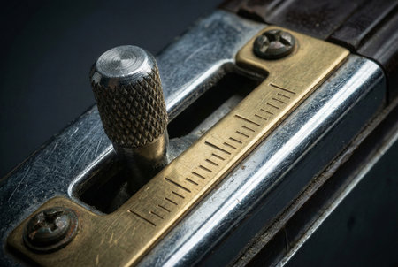 Close-up of a vintage metal tuning mechanism with a textured knob and engraved scale on a wooden surface. Concept for precision adjustment, craftsmanship, and mechanical details.