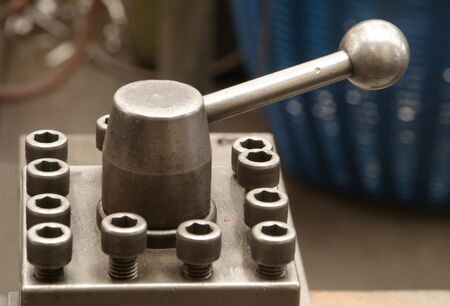 Old lathe for metal processing. Type of metal machine parts in lathe shop at factory. Industrial background. Industrial equipment..