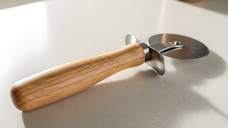 The image depicts a pizza cutter with a wooden handle and a circular blade. The cutter is placed on a white countertop. The wooden handle has a smooth finish, and the blade appears to be made of stainless steel. This tool is commonly used to slice pizza easily into even pieces.