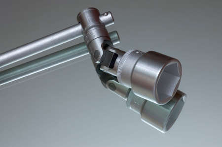 Universal socket sets. Can be used in hard to reach places. Knob for socket wrench nut ratchet close up. Ratchet wrench. Ratchet tool. Steel made no skid threaded handle hold firmly without slipping.