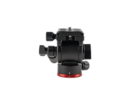 Front view of tripod video head with multiple adjustment knobs, isolated on white background. Ideal for stable and precise video shooting.