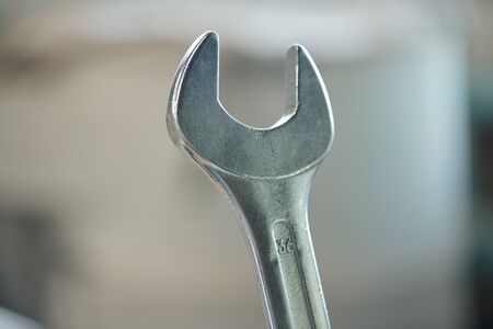 Close-up of metal wrench used to turn bolts and nuts in workshop, mechanics tool