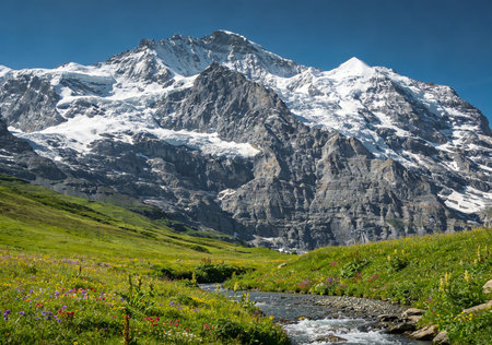 beautiful swiss landscape Bernese Oberland. meadow with alpine flowers and view to Schreckhorn mountain, switzerland
