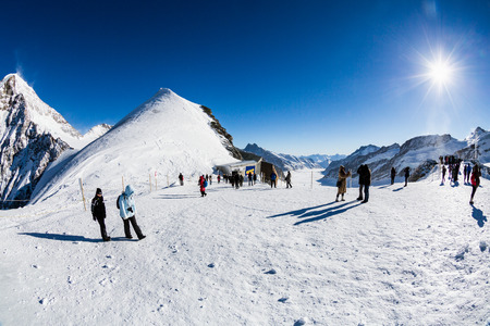 Jungfraujoch, Switzerland - Oct 20, 2018. Beautiful snow Alps Mountain with tourists at Jungfraujoch Station, Switzerland.