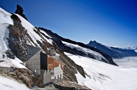 JUNGFRAUJOCH, SWITZERLAND - JANUARY 6, 2017: View to the Jungfraujoch observation station and Aletsch Glacier on January 6, 2017. Its the highest elevated point to reach by a cog railway in Europe.