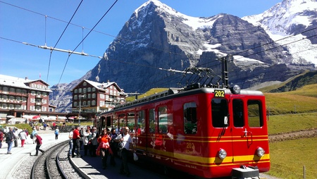 Swiss train at Kleine Scheidegg station in Jungfrau area