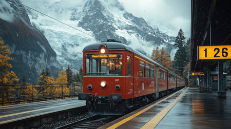 Red Train with Jungfrau Mountain, Switzerland