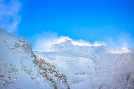 Beautiful winter landscape with snow-capped mountains and blue sky