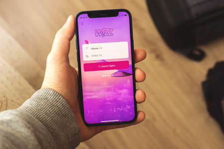 Kharkov, Ukraine - February 5, 2021: close up Wizzair application on Apple smartphone, Hungary airlines app background, creative flat lay banner for traveler