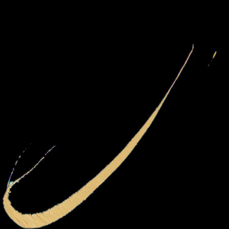 A dynamic swirl of yellow and orange powder forms a crescent shape against a black background with scattered particles.