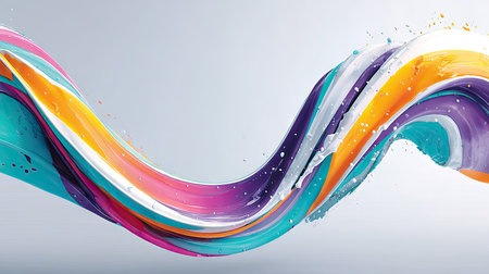 An abstract design presents a flowing wave of diverse colors, including teal, orange, purple, and white. The composition features a smooth gradient background that enhances the vibrant wave's curves. This graphic style is suitable for various commercial applications such as marketing, web design, and decorative projects.