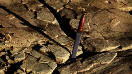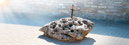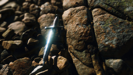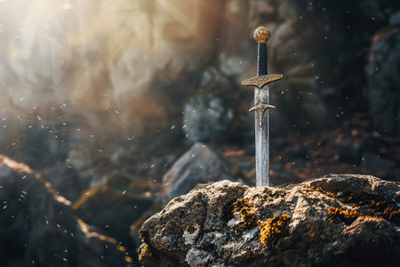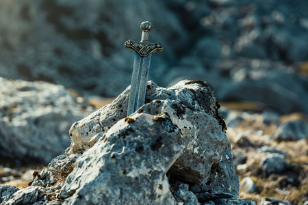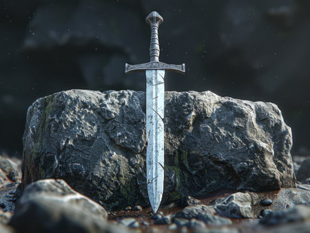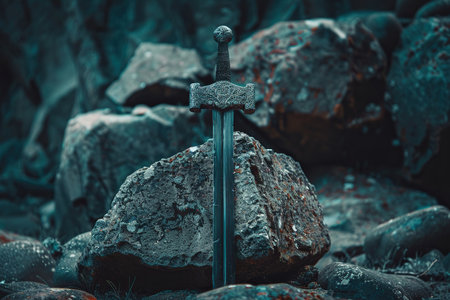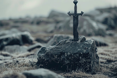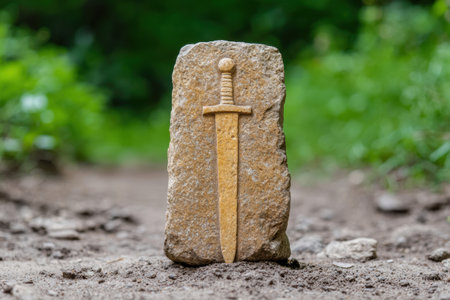 Discover the enchanting image of a sword firmly placed in a stone, symbolizing heroism and timeless myths.
