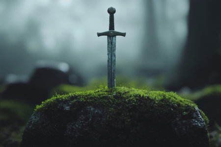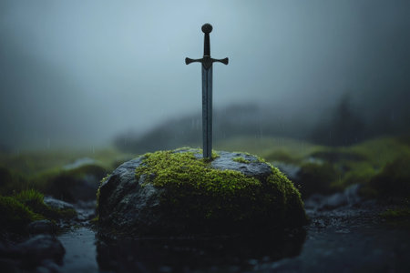 A legendary sword stands embedded in mossy stone amidst misty highlands, evoking fantasy tales and ancient heroic quests.