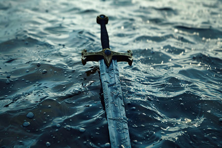 King Arthurs legendary sword, Excalibur, rests gracefully atop a rugged rock, symbolizing power and ancient tales of honor and valor.