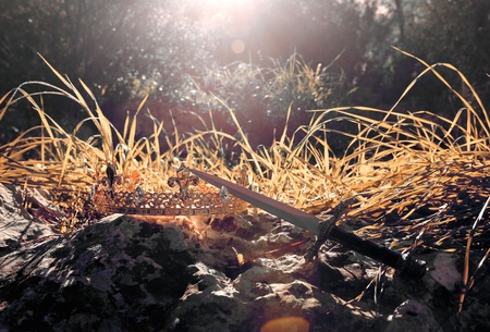 Medieval knight sword standing on a stone in the dark forest. Selective focus