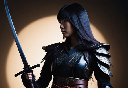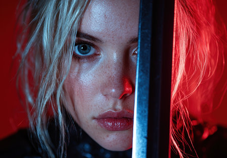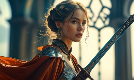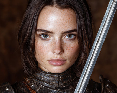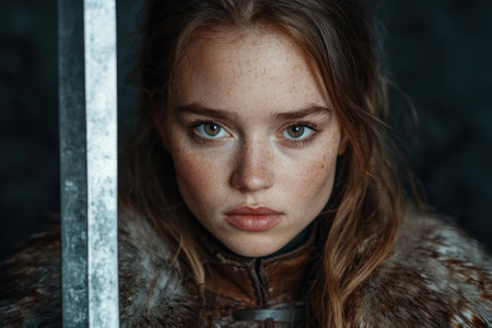 Portrait of a fierce female warrior holding a sword, surrounded by shadows and warm light