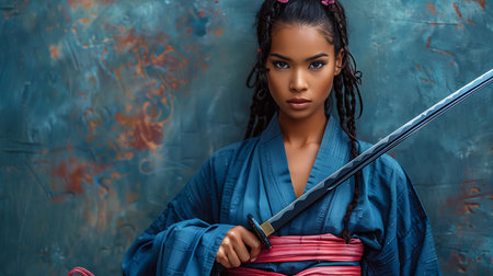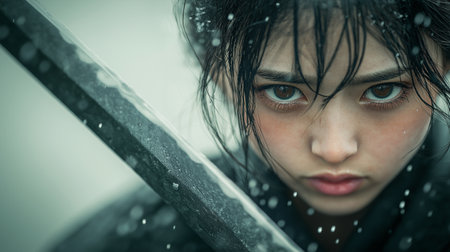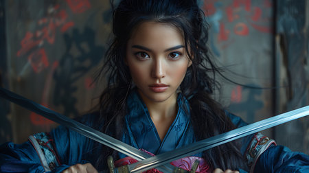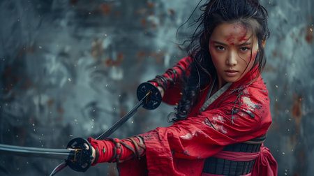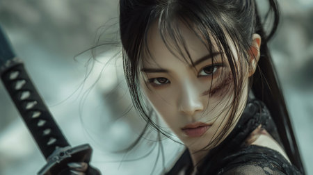 Strong woman warrior holding katana sword over shoulder, looking intensely