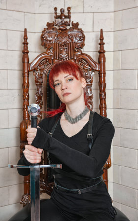 Beautiful redhaired woman warrior with sword sitting on the throne shows strength dominance fantasy