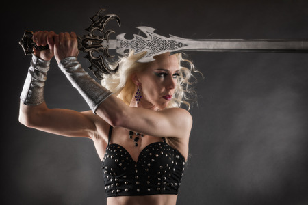 Performer woman wearing sexy costume and holding a sword, grey smoky background