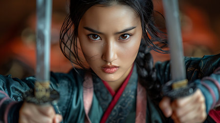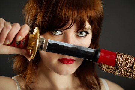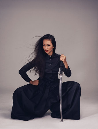 Closeup portrait of Asian lady with sword in studio. Beautiful woman ready for battle or fight with her opponents.