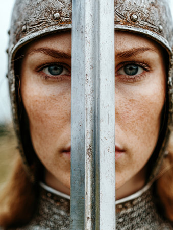 Stunning portrait of a young female warrior in detailed medieval armor, posing with a sword in the field