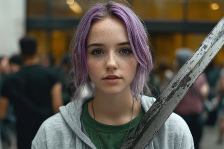 Portrait of an elf girl in a purple dress standing with a medieval sword in bright sunlight.