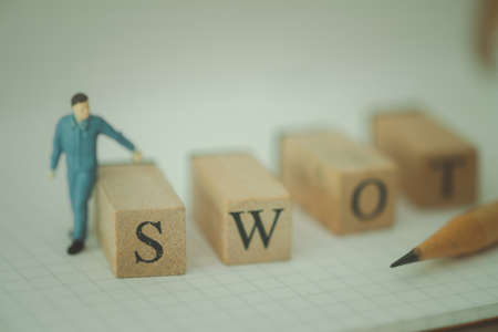 Miniature 4 people sitting on wood word SWOT using as background business concept and Strategy concept with copy space for your text or design.