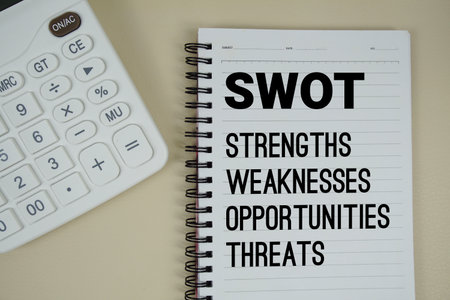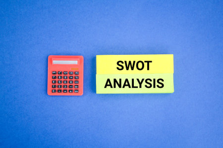 SWOT Abbreviations of Strengths, Weaknesses, Opportunities, Threats text with calculator phrase of business and financial concept