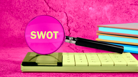 Acronym SWOT, Strength, Weaknesses, Opportunities and Threats through a magnifying glass on a calculator on a bright background with a stack of business notebooks in the background
