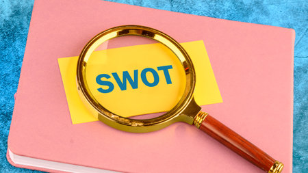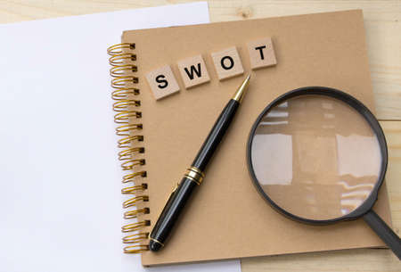 SWOT ANALYSIS. Search and research concept. Magnifying glass on office desk