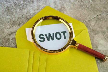 SWOT (SWOT analysis) text on paper sticking out of a mustard-colored envelope