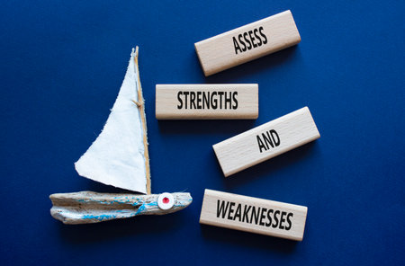 Strengths and Weaknesses symbol. Wooden blocks with words Assess Strengths and Weaknesses. Beautiful deep blue background with boat. Business and Assess Strengths and Weaknesses concept. Copy space.