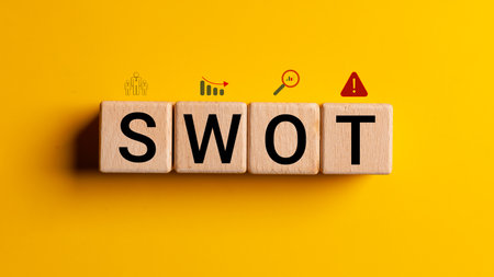 SWOT concept on wooden blocks with icons for strengths, weaknesses, opportunities, and threats on yellow background. Ideal for strategic planning, business analysis, and marketing visuals.