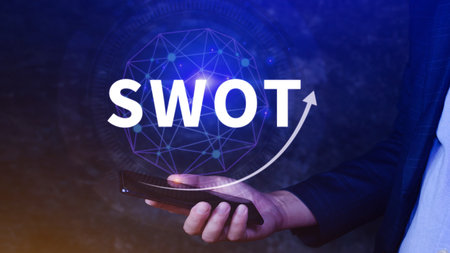 Businessman hand holding swot analysis strategy diagram on smartphone for business plan and growth, SWOT analysis concept.